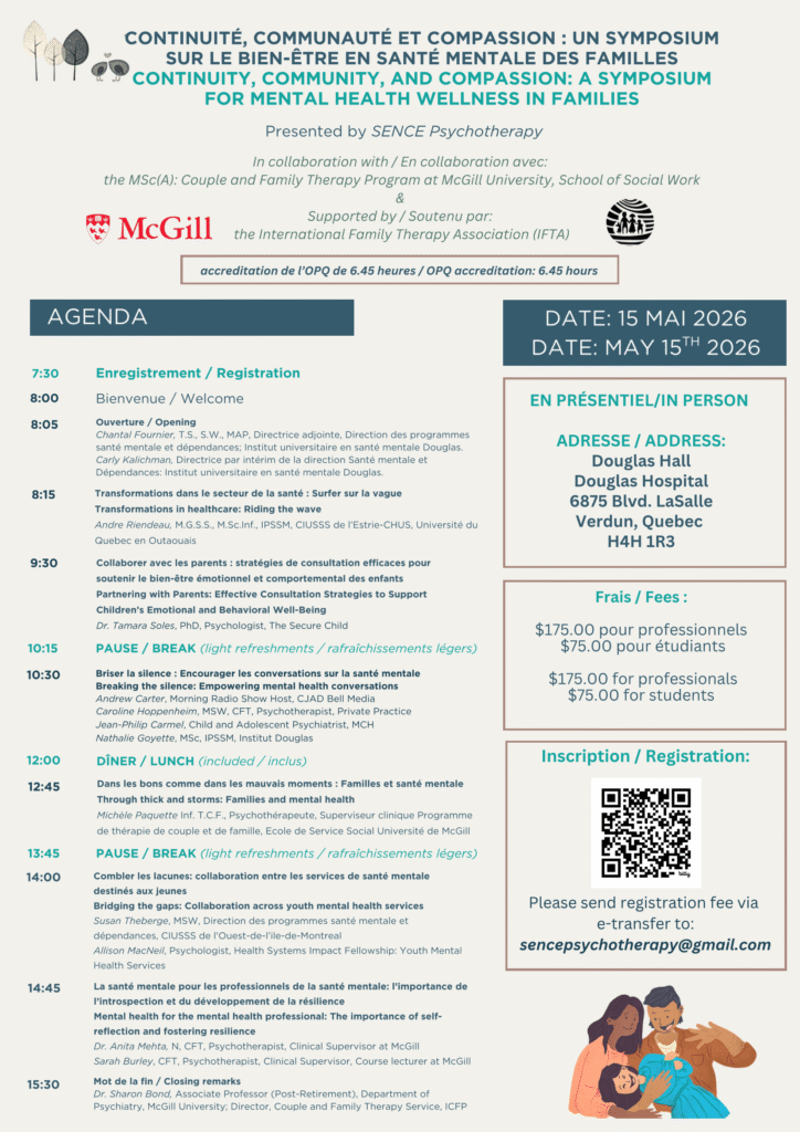 This event is organized by Dr. Anita Mehta—Registered Nurse, licensed Couples & Family Therapist, and founder of Sence Psychotherapy—in collaboration with McGill University School of Social Work, with support from the International Family Therapy Association.
